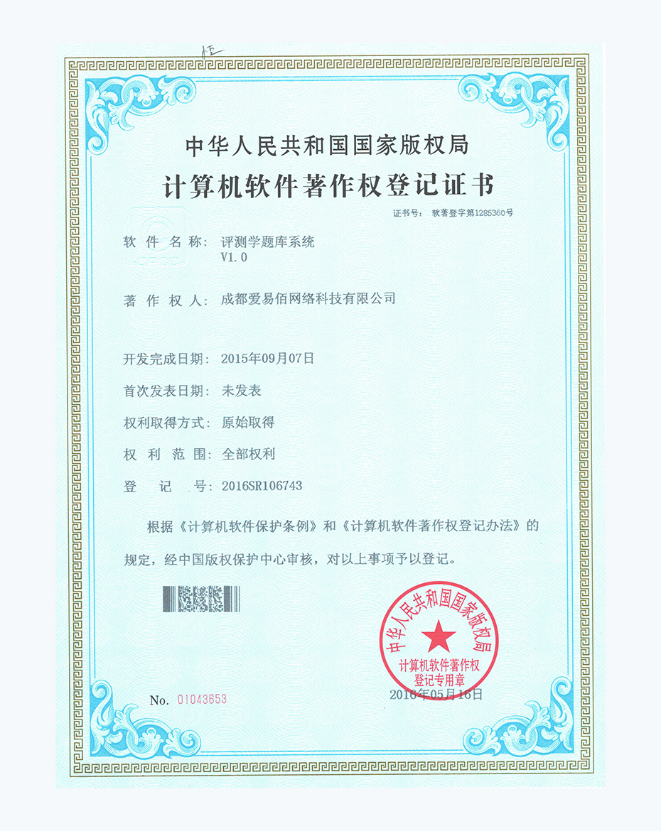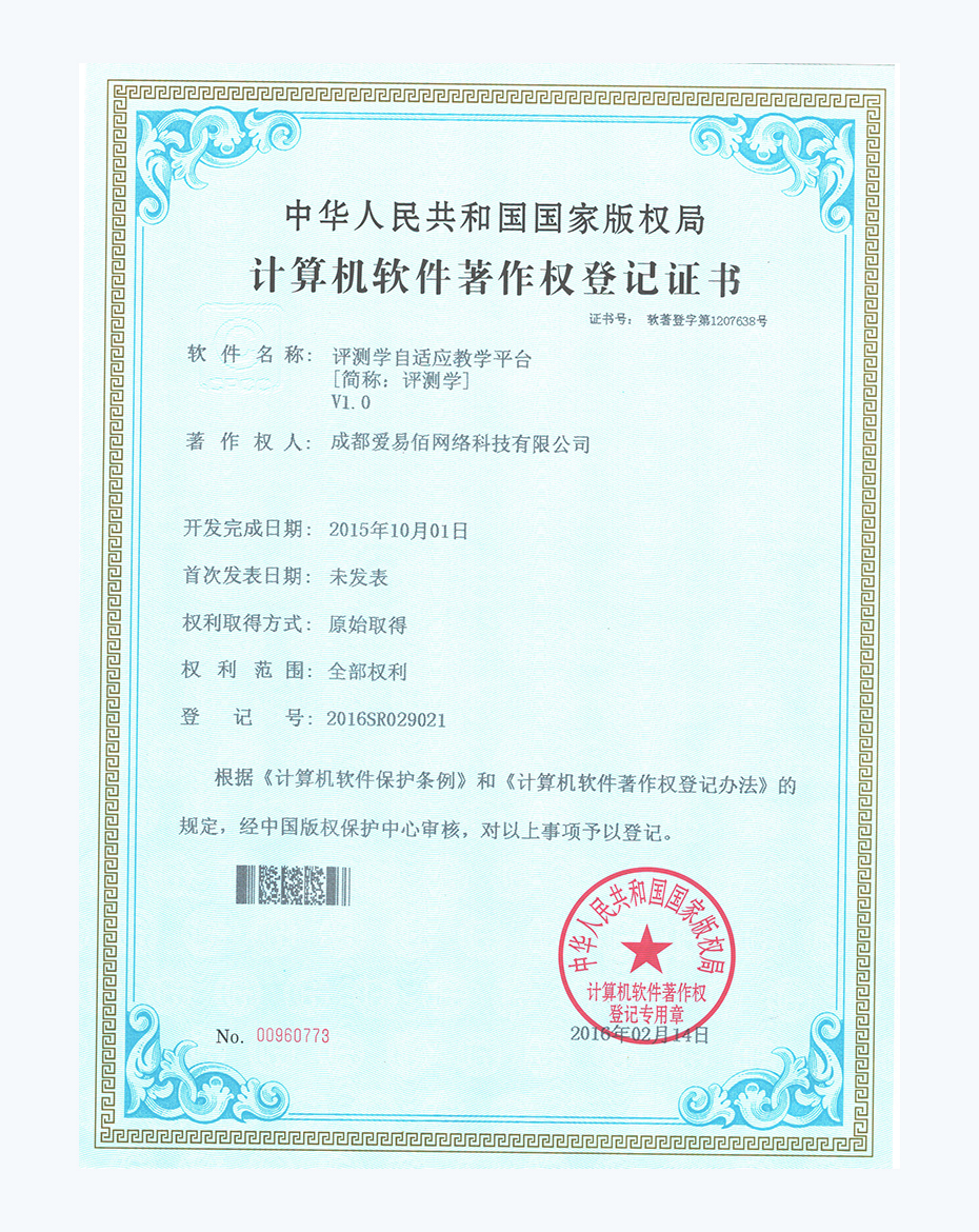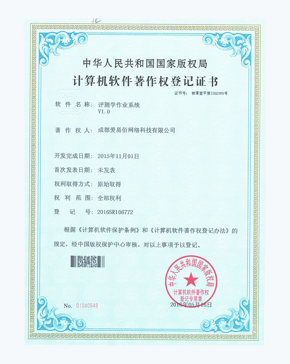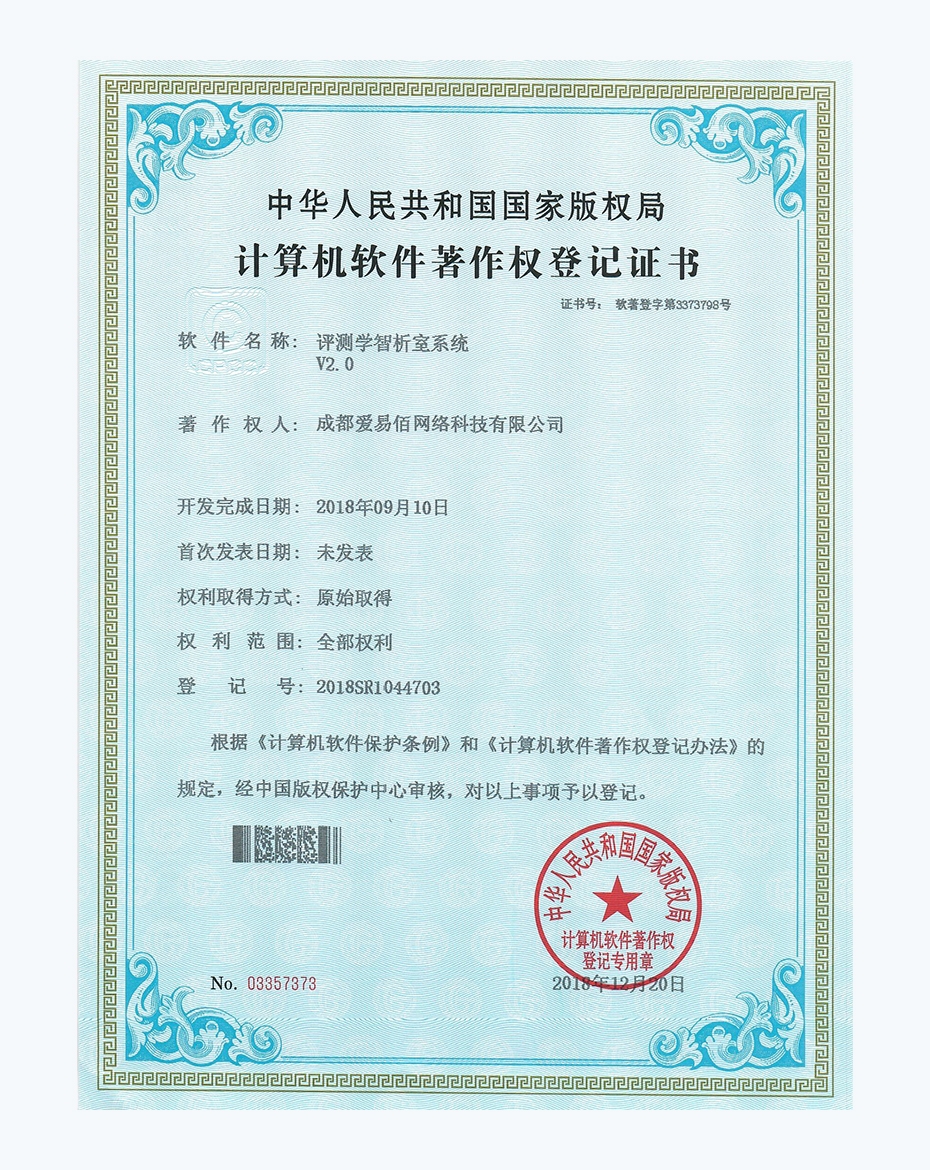 评测学在研发中获得7大专利发明保护,6大软件著作权证书,科研课题由省市迈向国家级,申报中央电教馆2017年度课题成功立项。